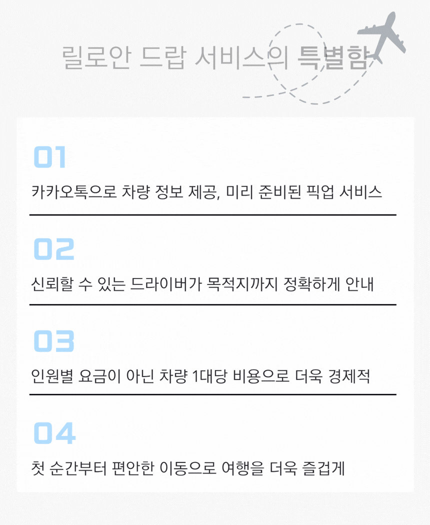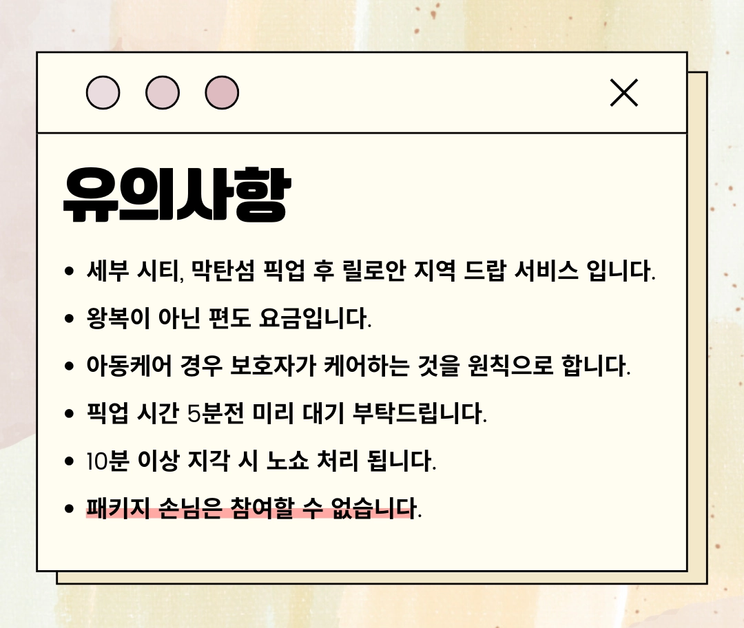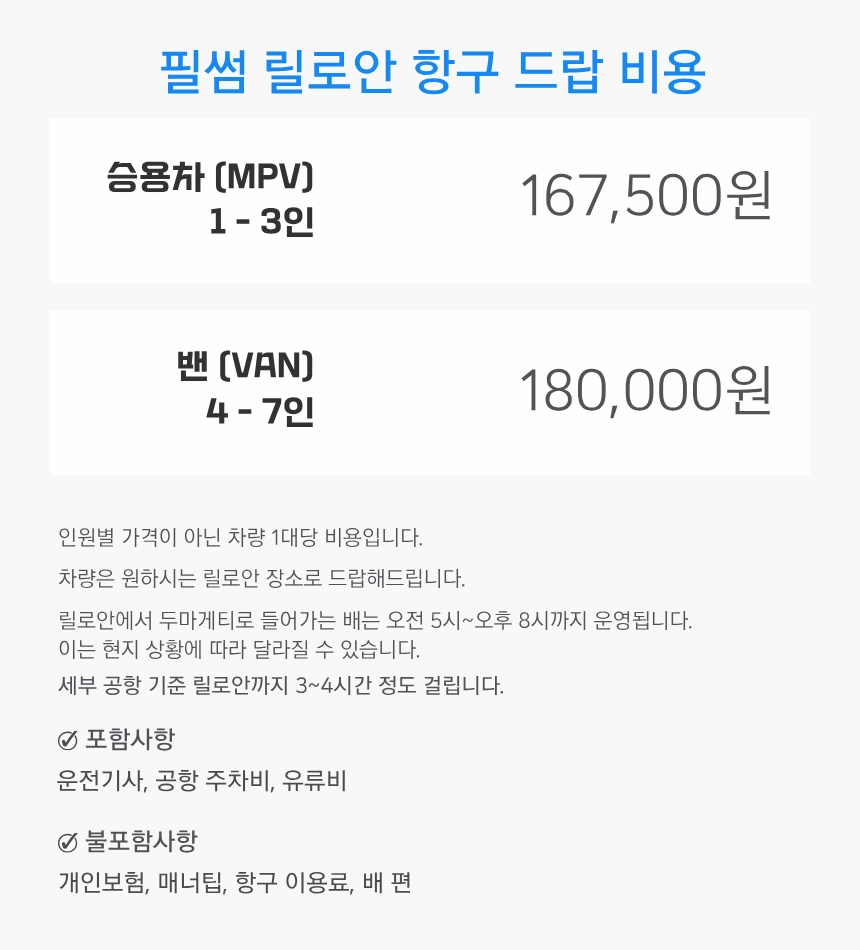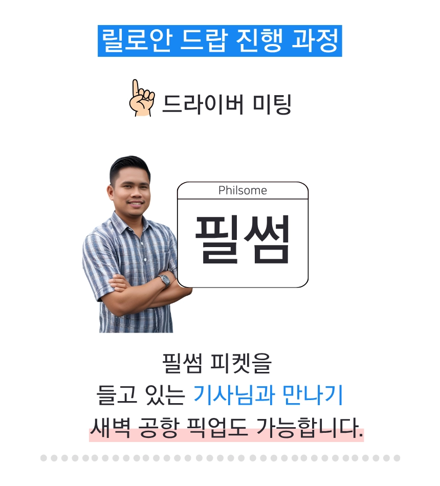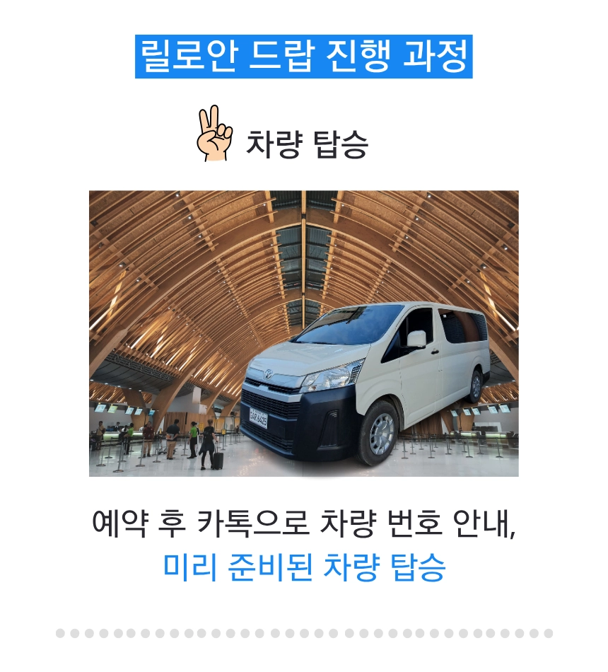 맞춤형 드랍: 릴로안 지역 내 원하시는 리조트나 목적지 어디든 드랍이 가능합니다.